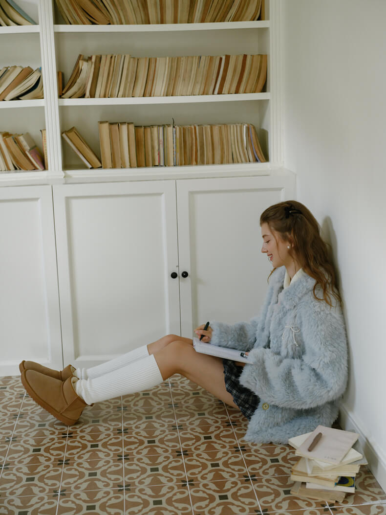 ふんわりとした素材感とパールリボンが上品に映える、ガーリーなふわもこアウター
