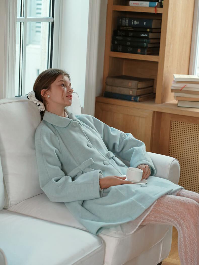 ・上品なミントカラーが冬の装いを明るく彩る、柔らかな印象のアウター。
