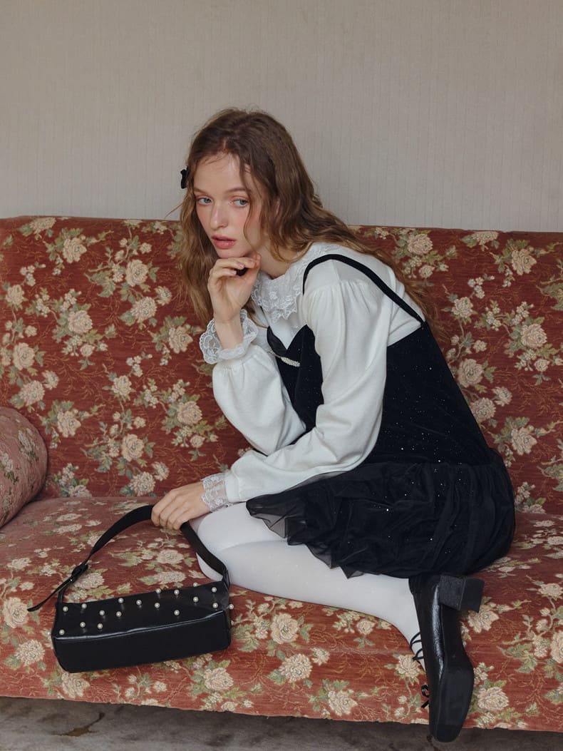 ベルベットの上質な質感とチュールの軽やかさが絶妙に調和し、可憐さと大人の品格を両立します。