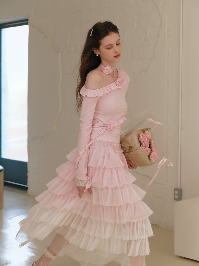 ・たっぷりと重ねられたチュールのティアードデザインが、歩くたびに軽やかで華やかな動きを生み出します。