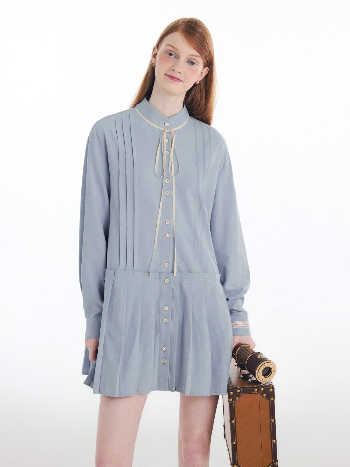 クラシックなリボンディテールとプリーツスカートが特徴の、上品なガーリーさを演出するワンピース
