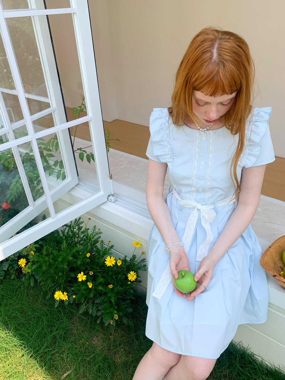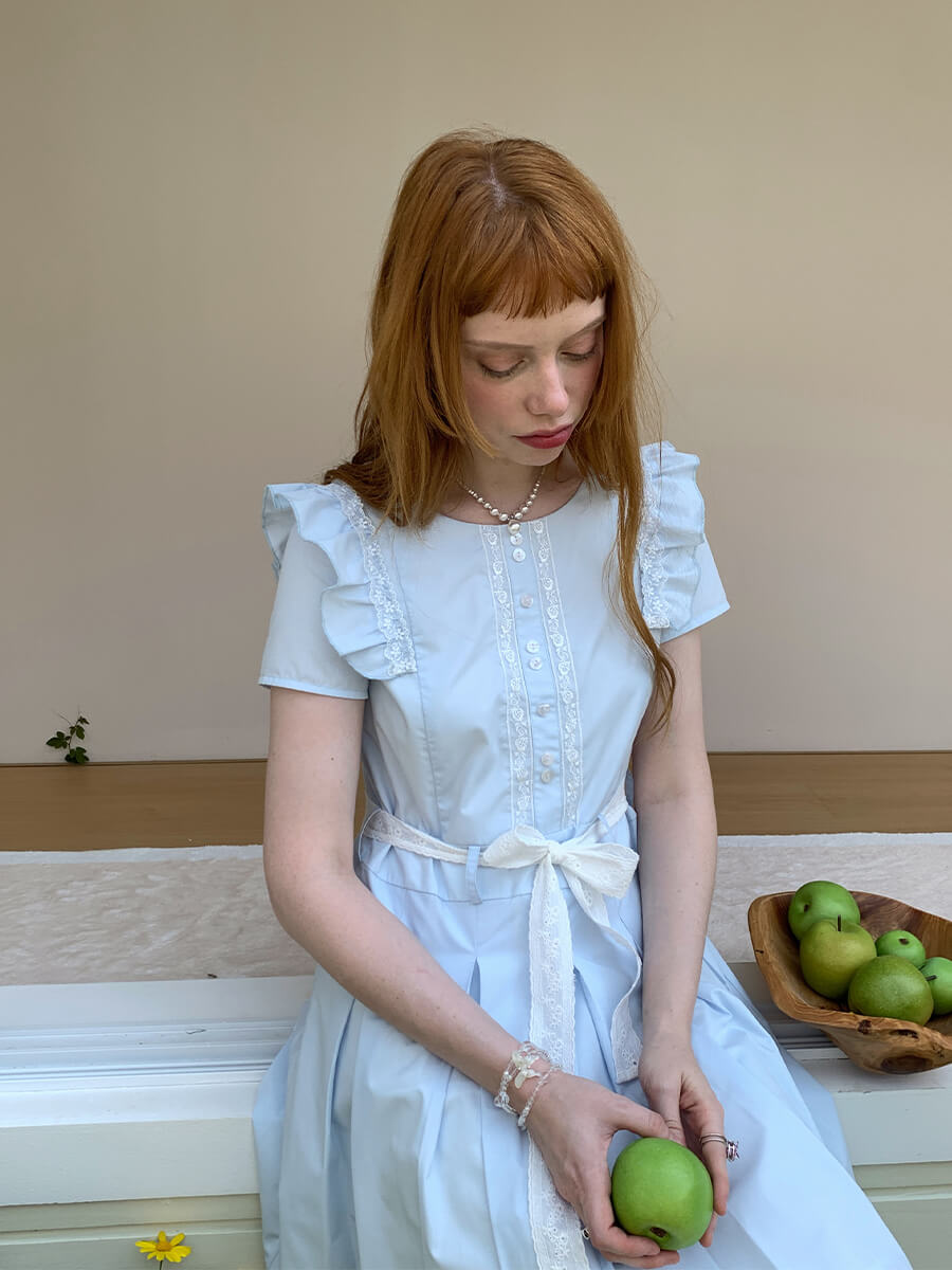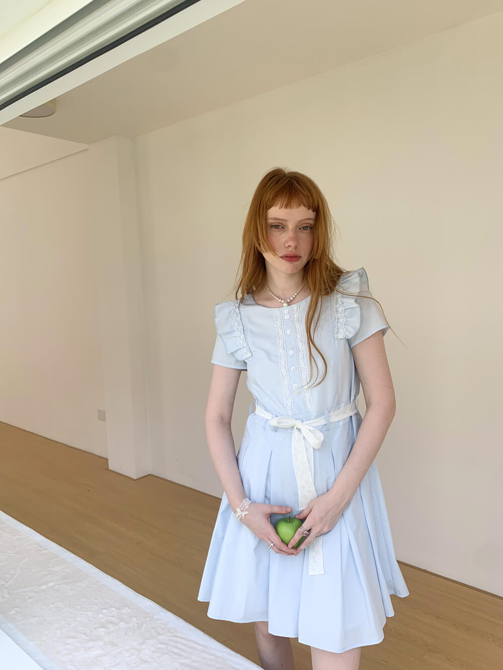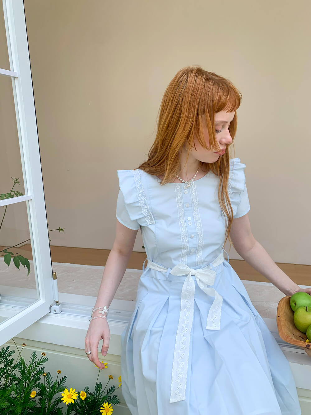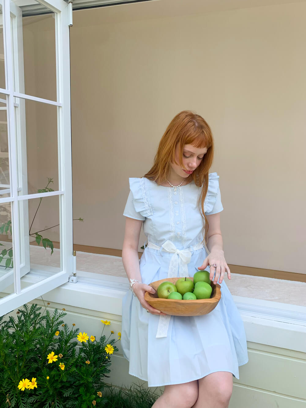 繊細なレースとリボンがロマンティックな、水色フリルワンピース