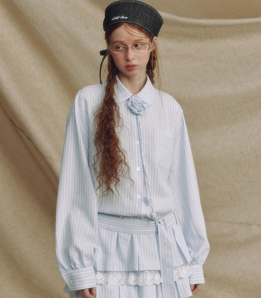 ・淡いブルーのストライプ柄で、清潔感のある印象に。