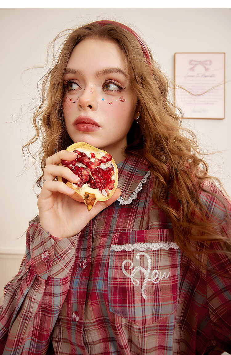 ・赤を基調としたクラシカルなチェック柄で、上品さと可愛らしさを兼ね備えた一着。