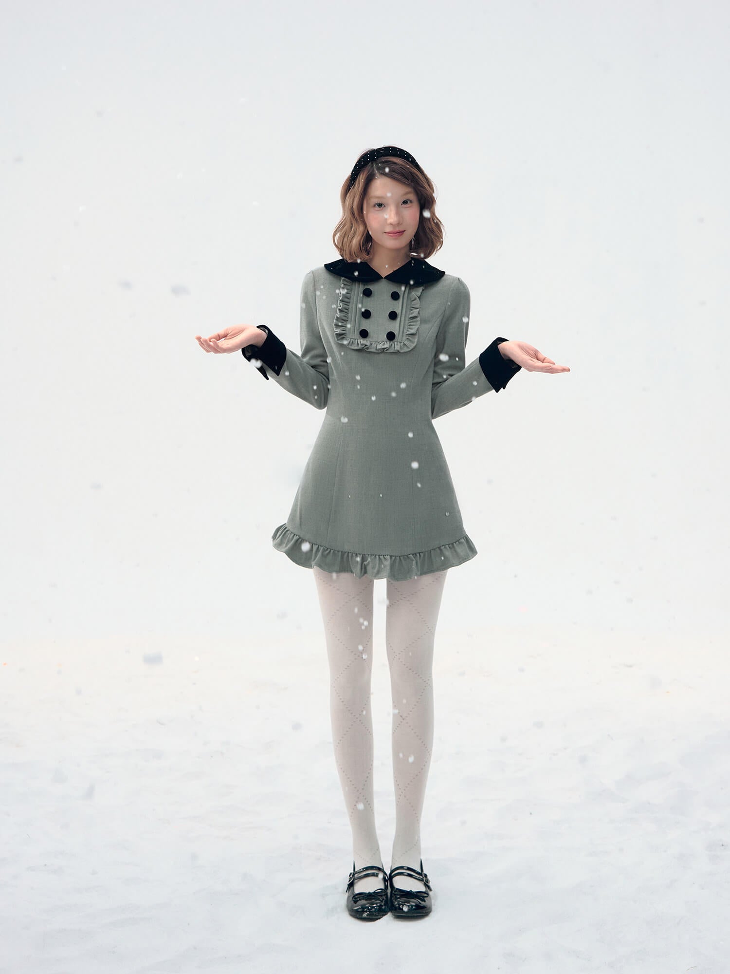クラシカルな雰囲気を纏える、ベルベット×フリルが上品に映える冬のミニワンピース