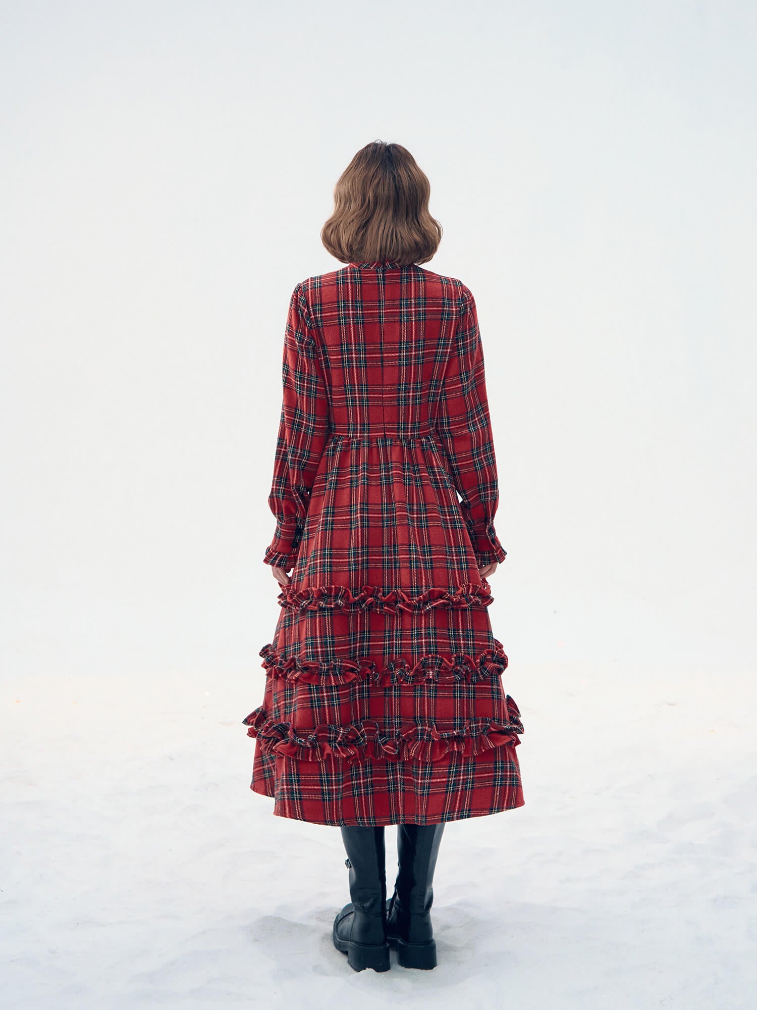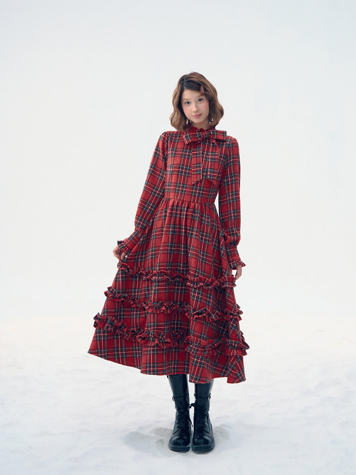 クラシカルなタータンチェックと贅沢に重ねたフリルが、視線を惹きつける主役級ワンピースです。