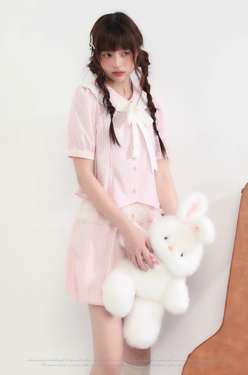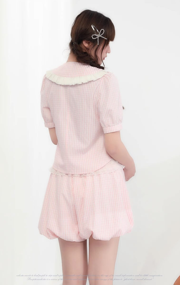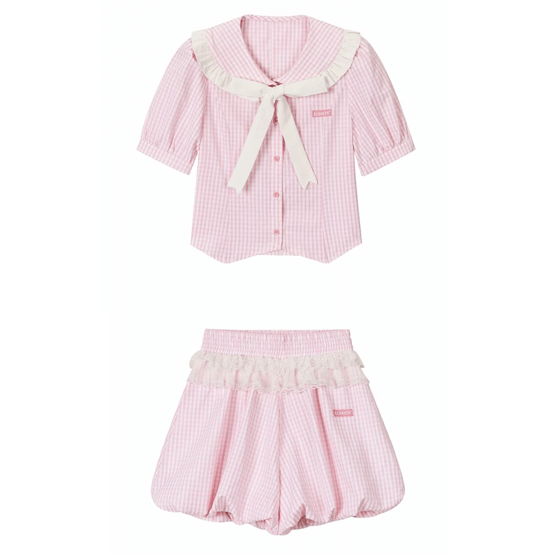 ふんわりガーリーに仕上がる、ピンクギンガムのフリルセーラーセットアップ