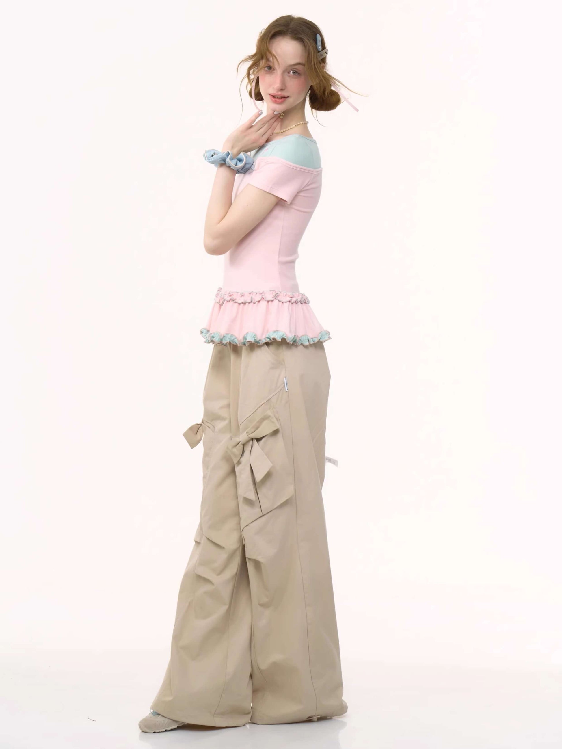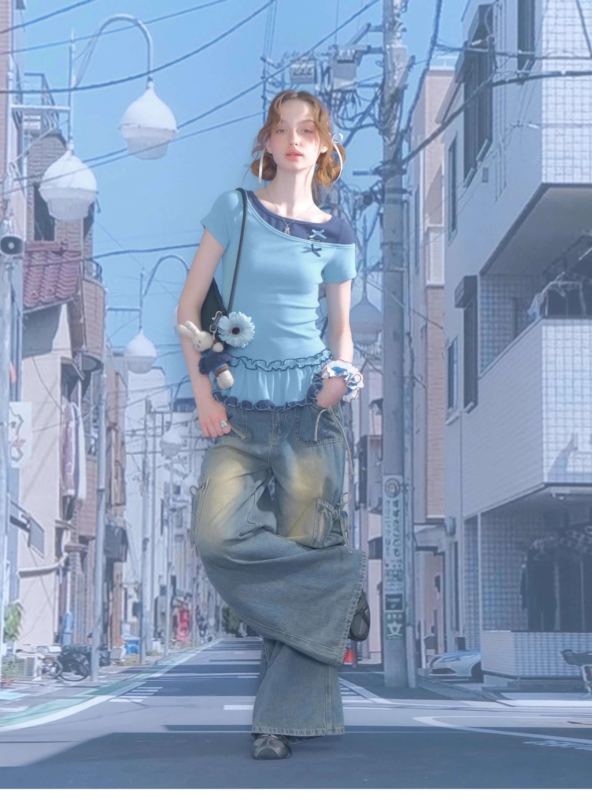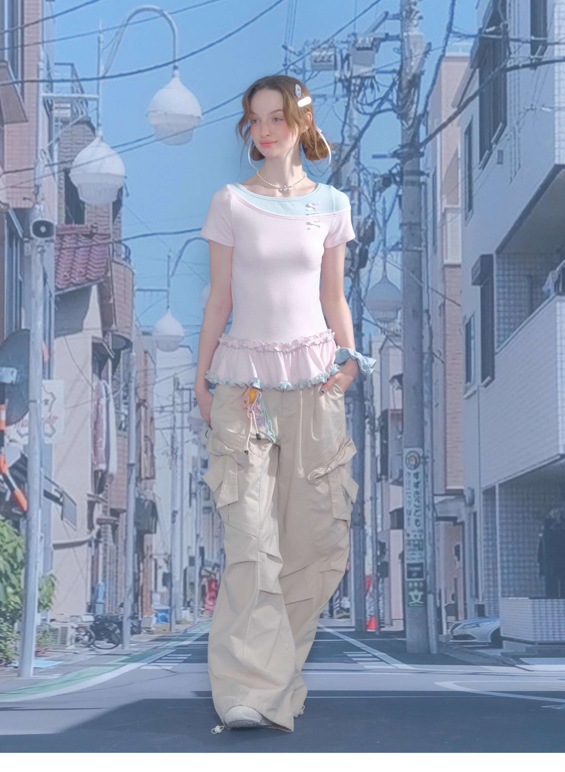 ガーリーなフリルとリボンがアクセントになったレイヤード風カットソー