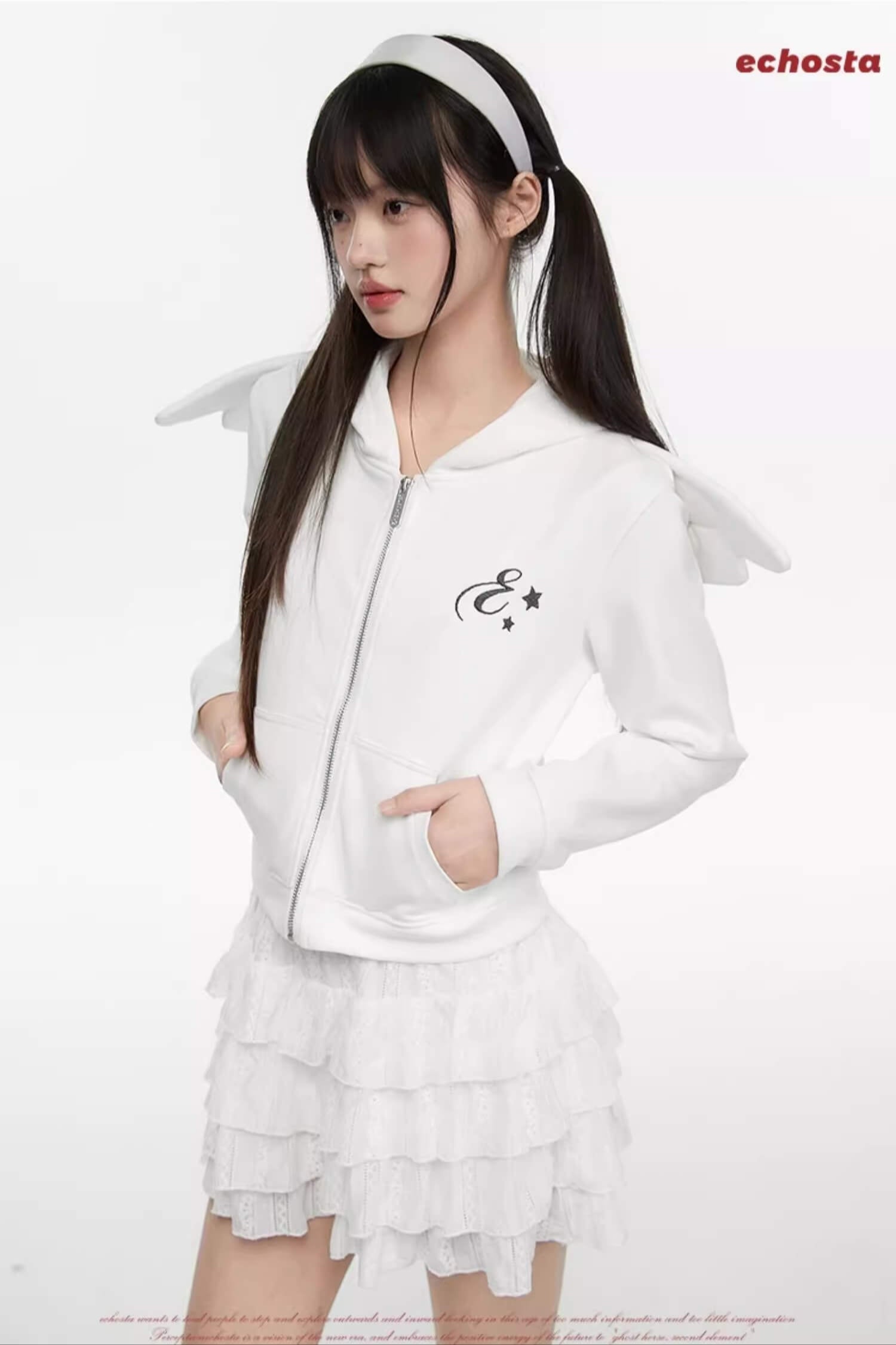 ふんわり羽をまとった、天使のようなホワイトジップパーカー